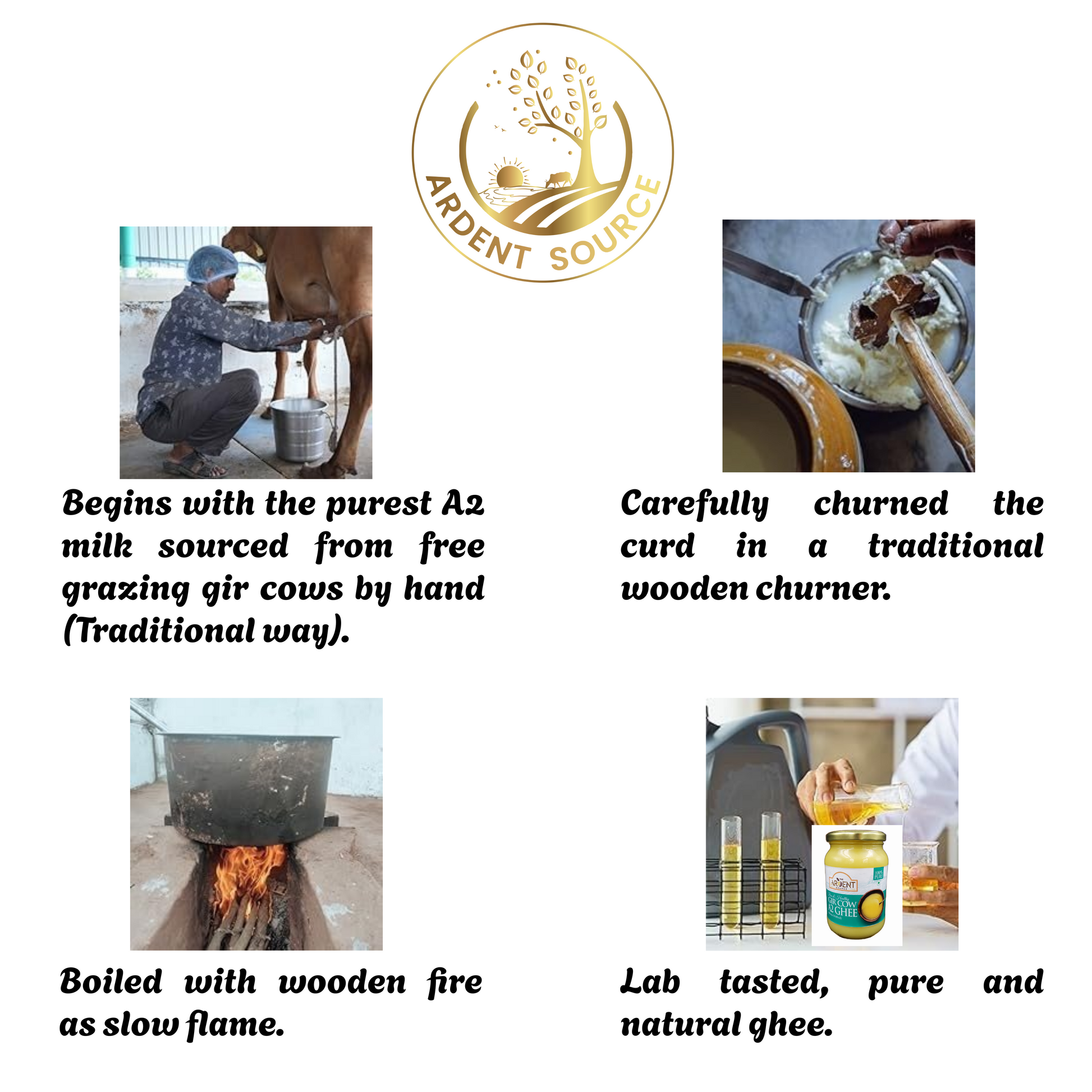 Ardent Source A2 Gir Cow Ghee is a premium-quality clarified butter made from A2 milk of grass-fed Gir cows, following the traditional Bilona churning method.