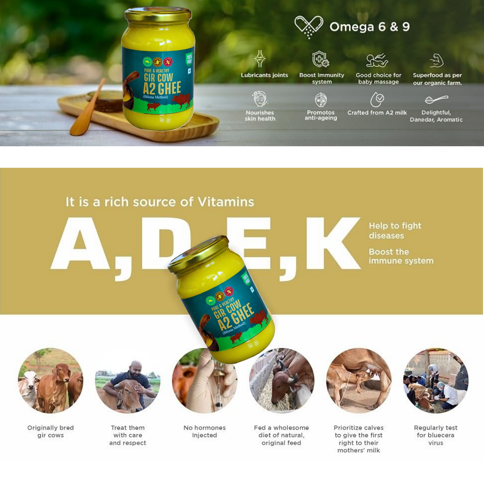 Sourced from ethically raised Gir cows, following natural grazing methods and cruelty-free practices. -